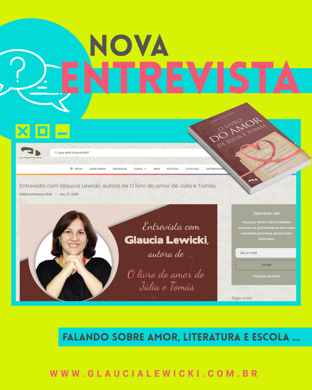 No dia 27/11, foi publicada uma breve entrevista comigo na página de uma das minhas editoras, a Dimensão. Nela, abordo o livro O Amor de Júlia e Tomás, integrante do PNLD 2024 e disponível para adoção pelas escolas do Ensino Fundamental II.